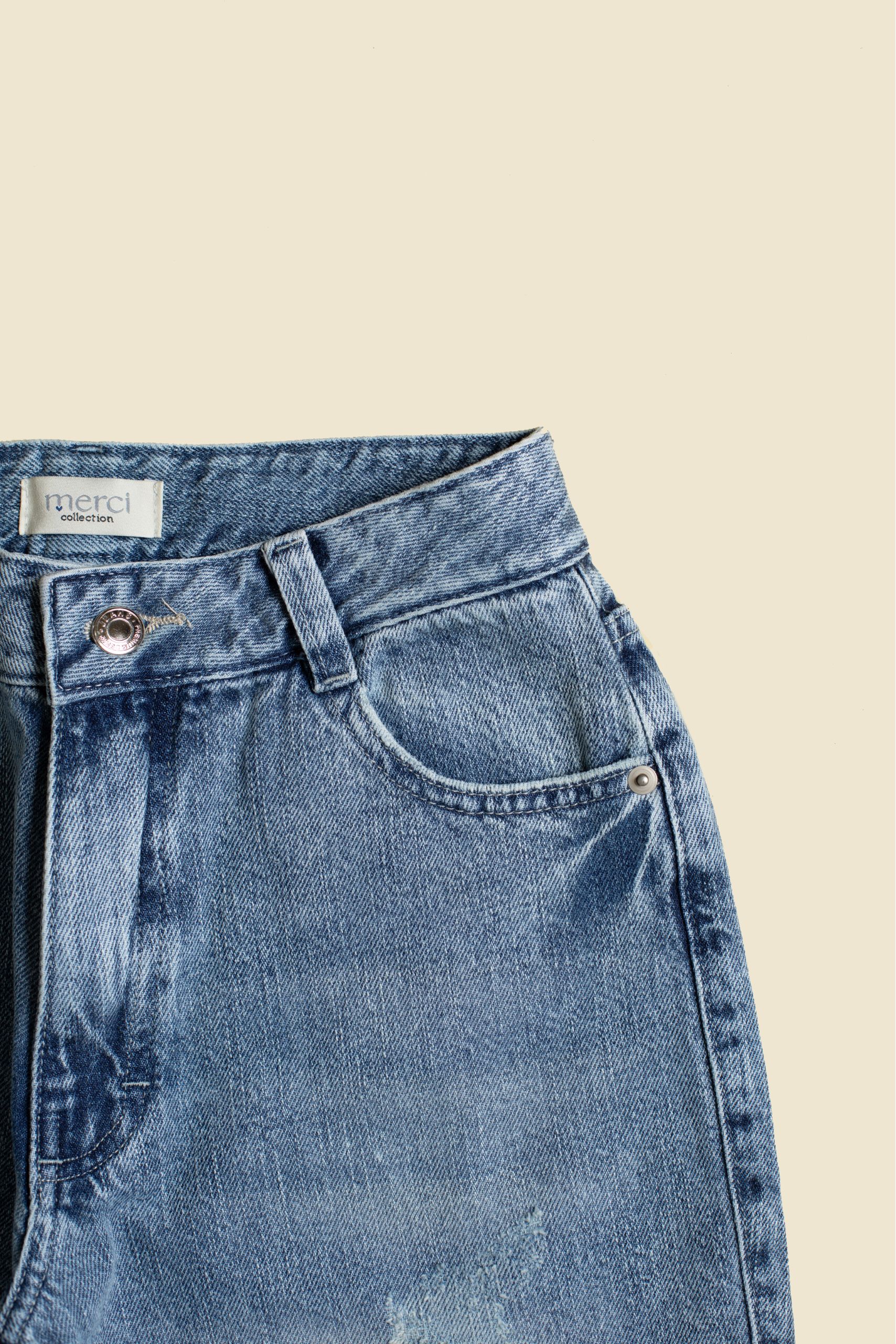 Su diseño mantiene la estética auténtica del jean clásico, incorporando cinco bolsillos funcionales, presillas para cinturón y cierre frontal con cremallera y botón metálico, logrando una prenda equilibrada entre estilo y funcionalidad.
