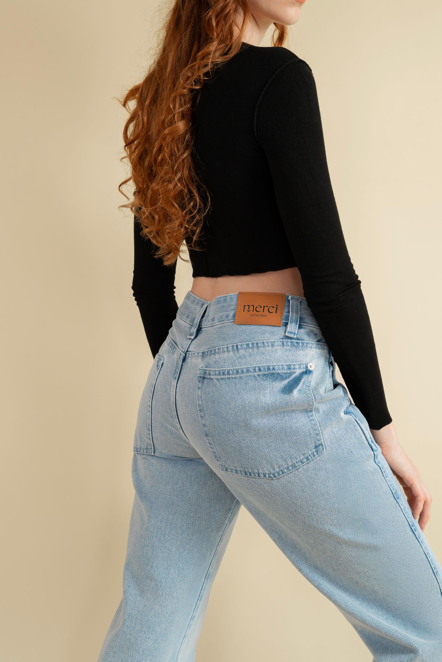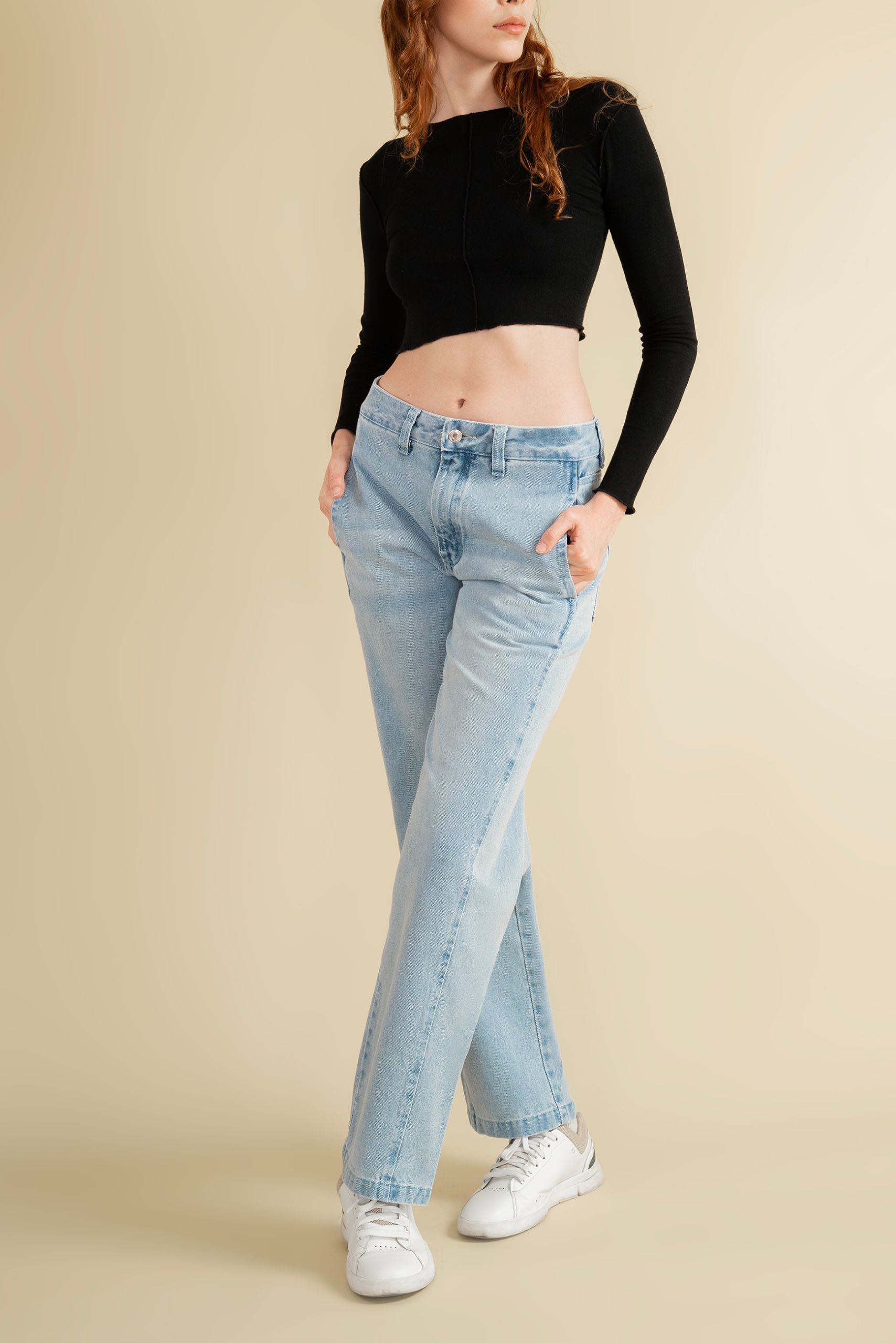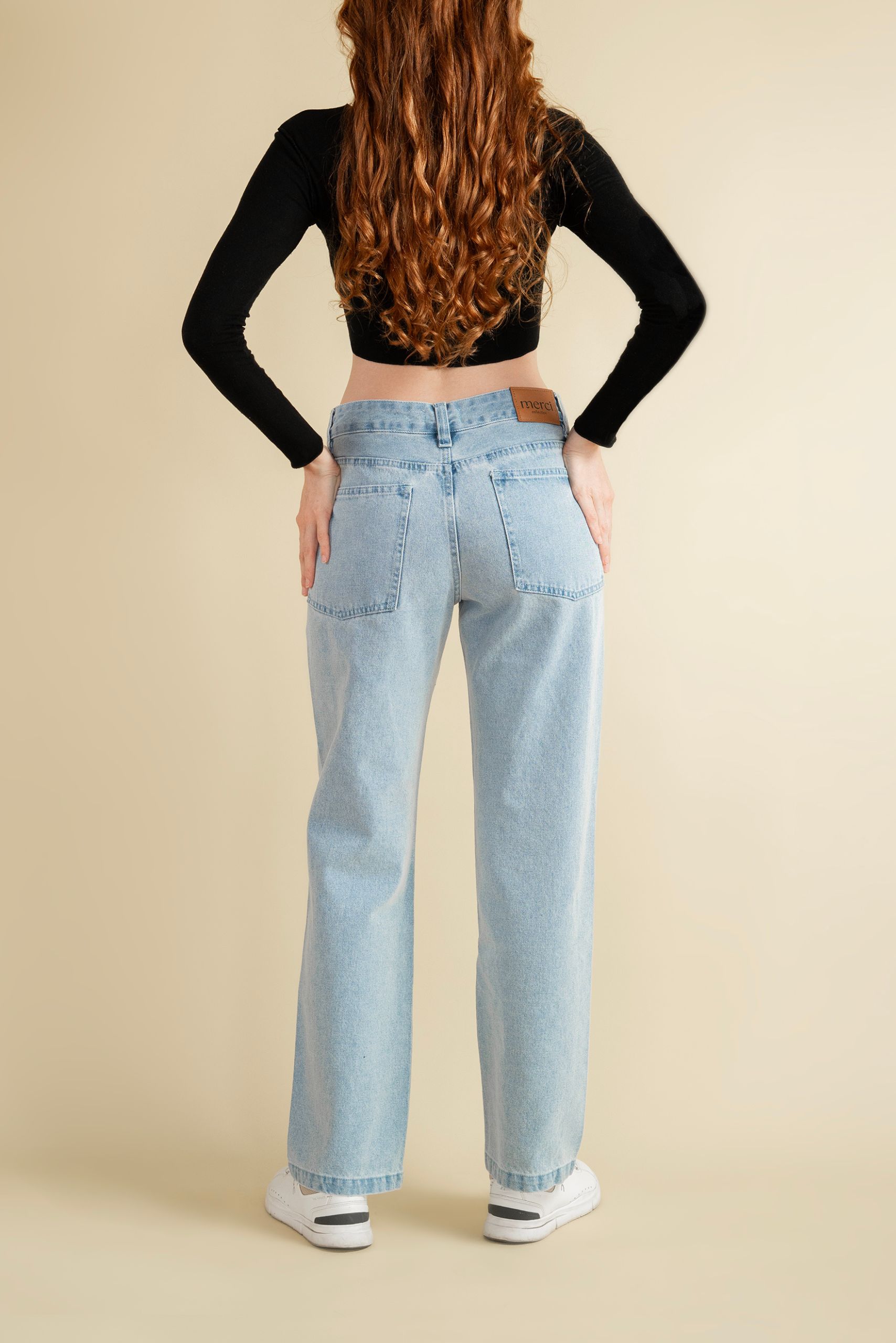Este jean straight wide-leg de tiro medio en tono azul claro ofrece una silueta relajada y moderna. La pierna ancha, que se extiende desde la cadera hasta el tobillo, junto con la bota recta, crea un look fluido y estructurado.