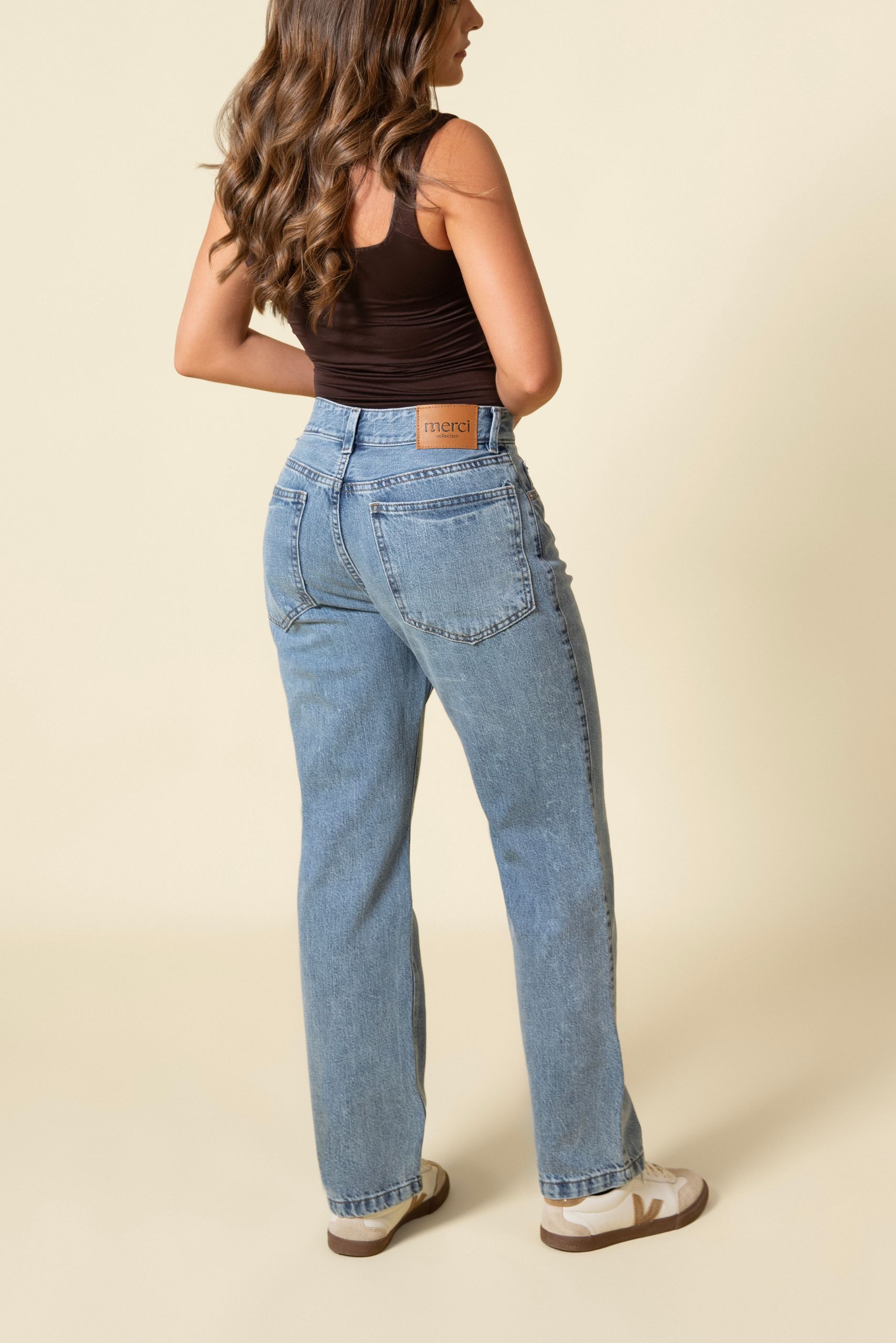 Este jean de tiro medio destaca por su diseño moderno y elegante, pensado para estilizar la silueta y aportar un look actual. Su corte recto, con caída limpia desde la cadera hasta el bajo, ofrece un ajuste equilibrado y favorecedor, ideal para un estilo urbano y contemporáneo.