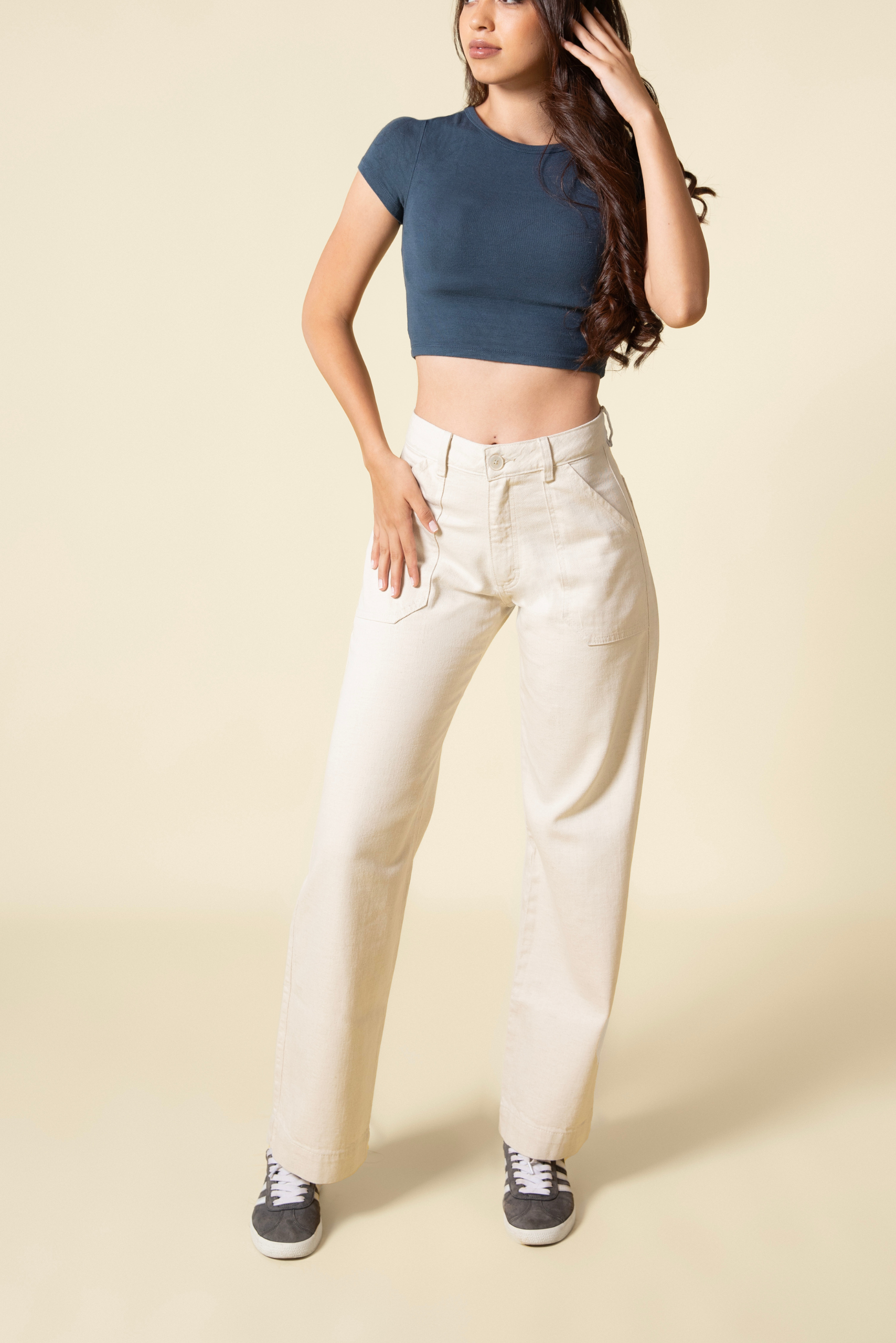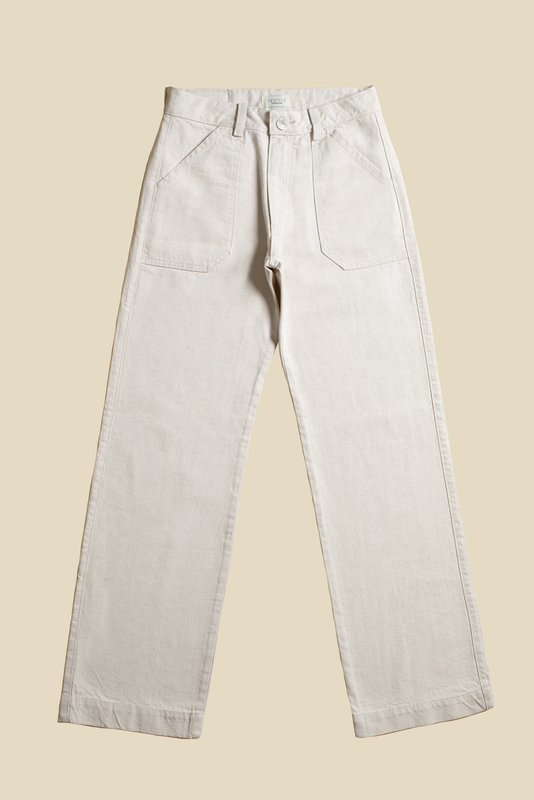 Este jean de tiro medio y silueta wide leg destaca por su diseño sofisticado y contemporáneo. Su tono hueso, neutro y luminoso, lo convierte en una prenda altamente combinable, ideal para looks elegantes y actuales tanto de día como de noche.
