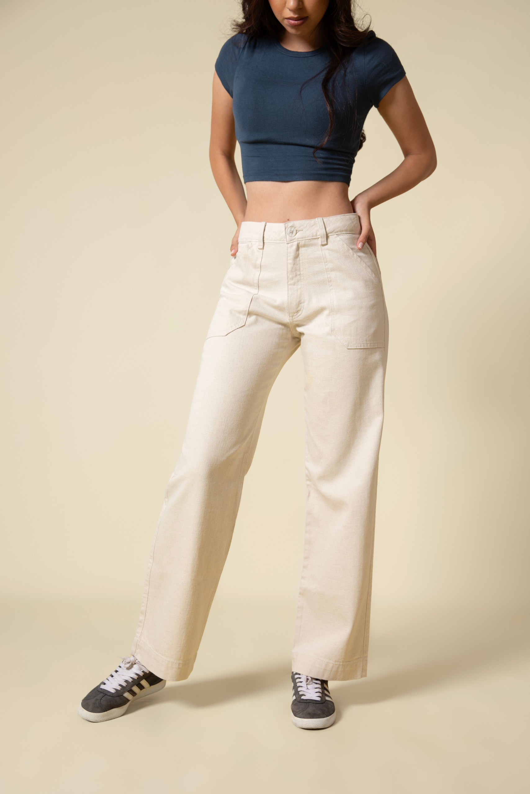 Confeccionado en denim rígido de tacto ligero 100% algodón, ofrece estructura sin perder comodidad, logrando una caída fluida y favorecedora. Incorpora bolsillos superpuestos tanto en el frente como en la parte posterior, aportando un detalle funcional y de diseño.